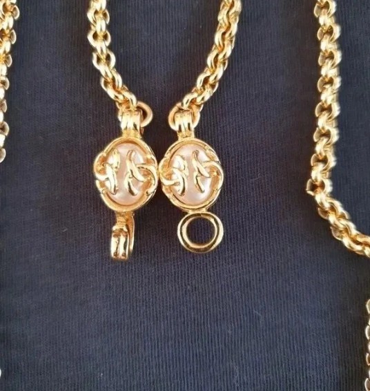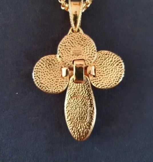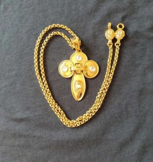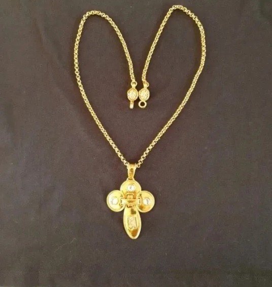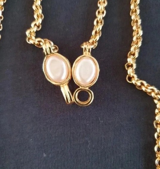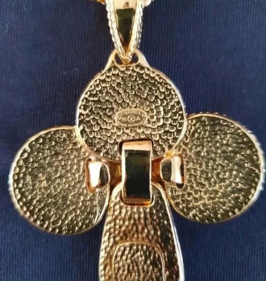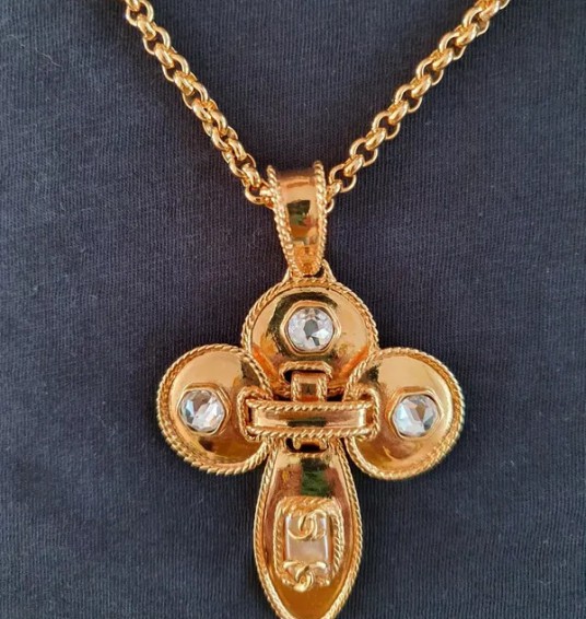 Цепочка и подвеска Chanel в форме креста из золотистого металла со стразами и жемчужно-белыми бусинами.